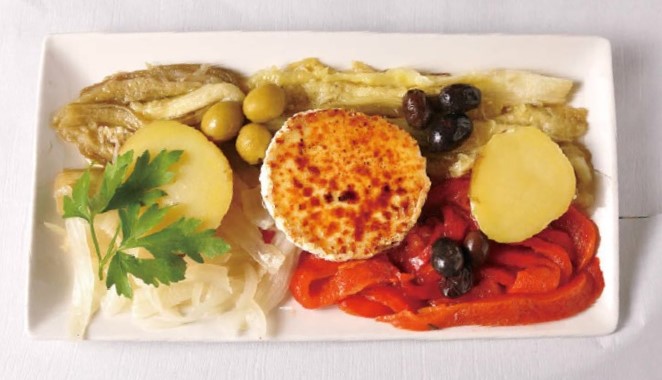 焼き野菜にヤギのチーズのキャラメリゼをのせた、エスカリバーダ・コン・ケソ・デ・カブラは€9.50。