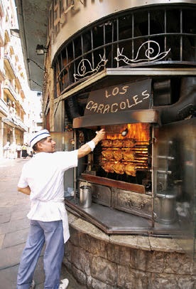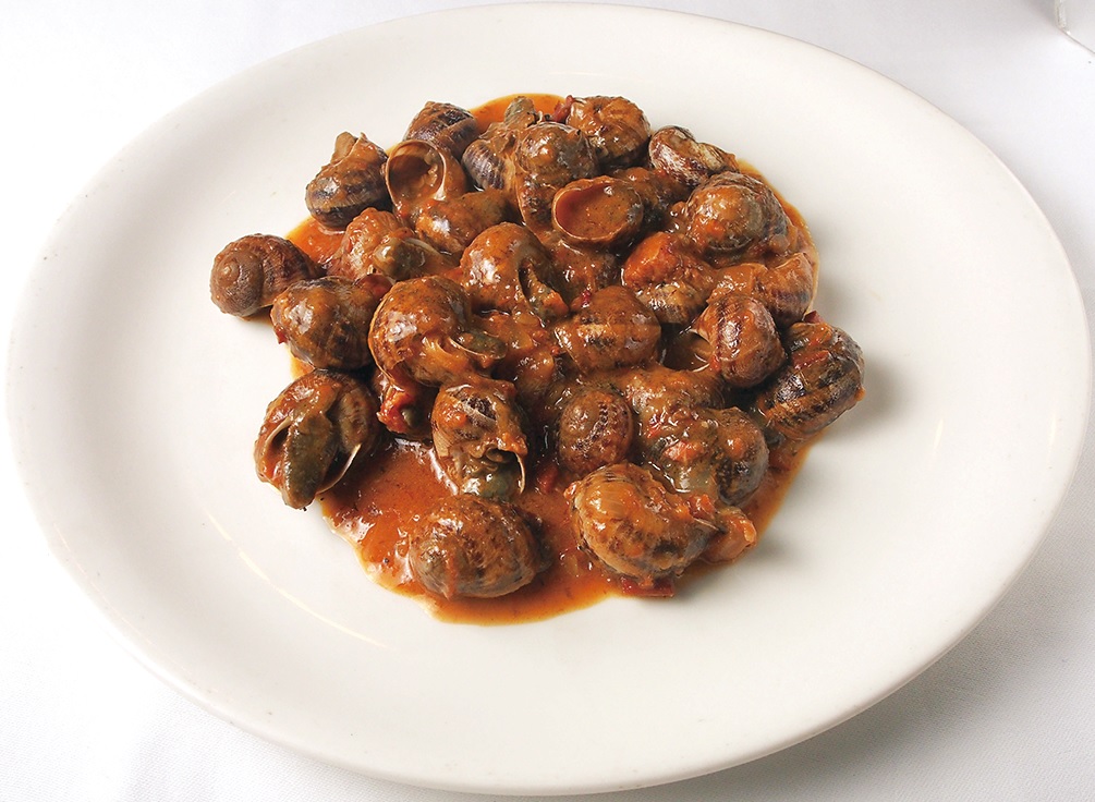 名物料理のカラコレス(€12.65)は、カタツムリを少し辛めのトマトソースで煮込んだ料理。巻き貝を食べるときのように楊枝を使っていただきます。