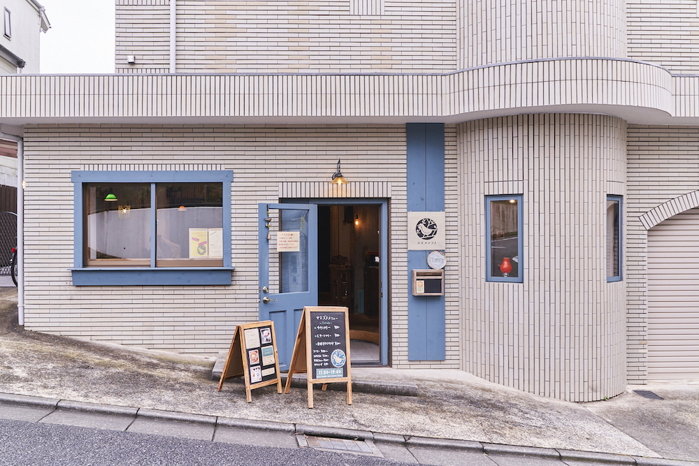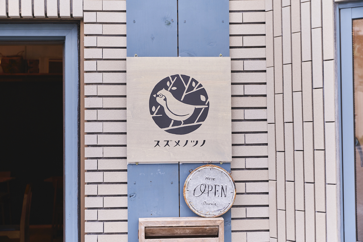 カフェ「スズメノツノ」は、坂道の途中にあります。青い扉が口を開け、入り口のランプが手招きしているような、まるで宮沢賢治の世界にでも迷いこんだかのよう。スズメのイラストが印象的な看板を見たら最後、そのかわいさに誰もが足を踏み入れてしまうのです。