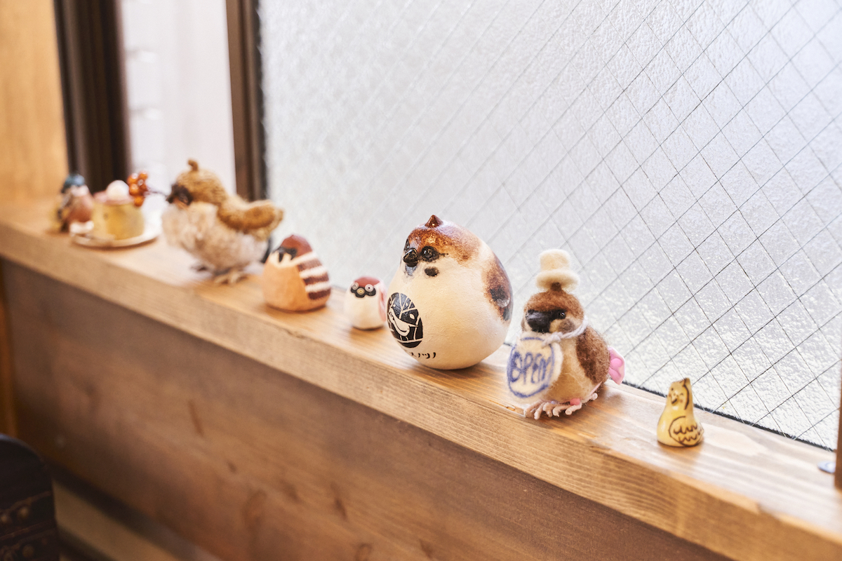 また、店内のお楽しみのひとつが、店名にちなんだツノ付きスズメの作品鑑賞です。「スズメノツノ」というユニークな店名にインスパイアされた作家さんたちが、作品を作っては持って来てくれるのだかとか。