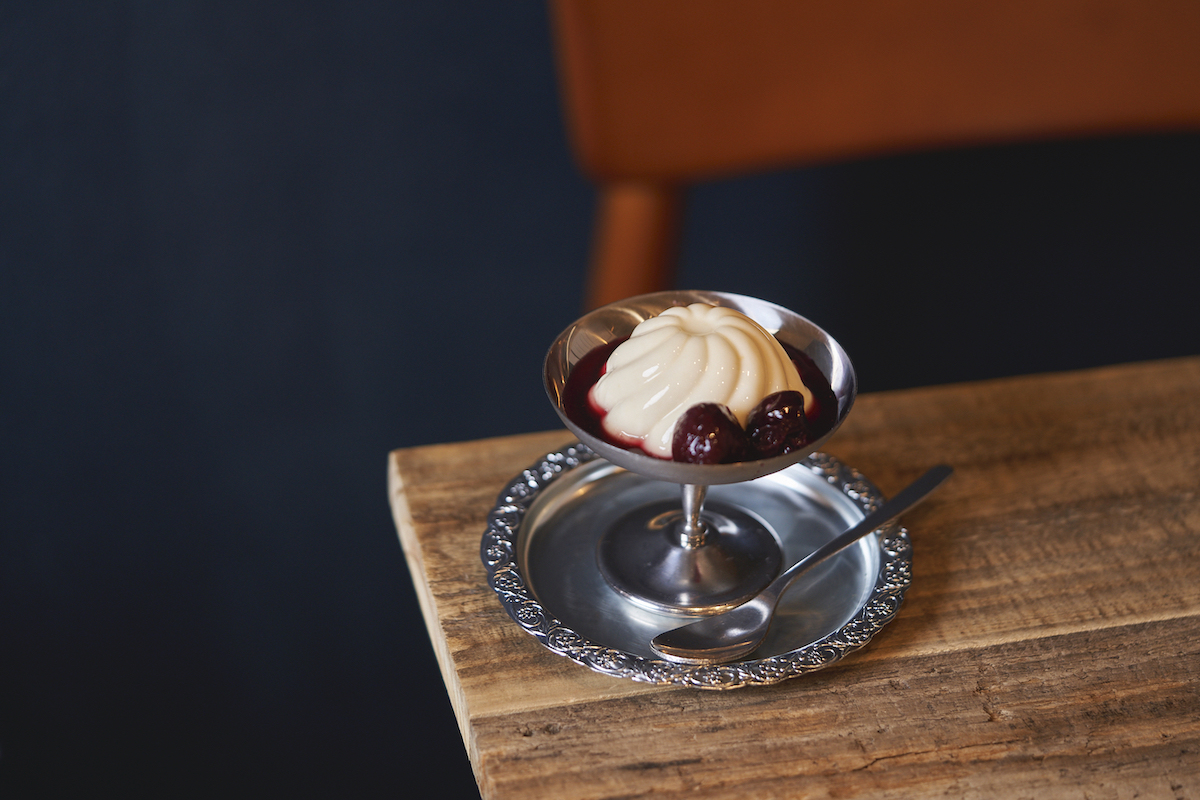 焼きプリンのほかにも、写真を撮らずにいられないのがこちらの「イニシエノババロア」(550円)。取材した夏はチェリーソースがたっぷり添えられていましたが、季節メニューにつき、取り扱いがない時期もあるそう。