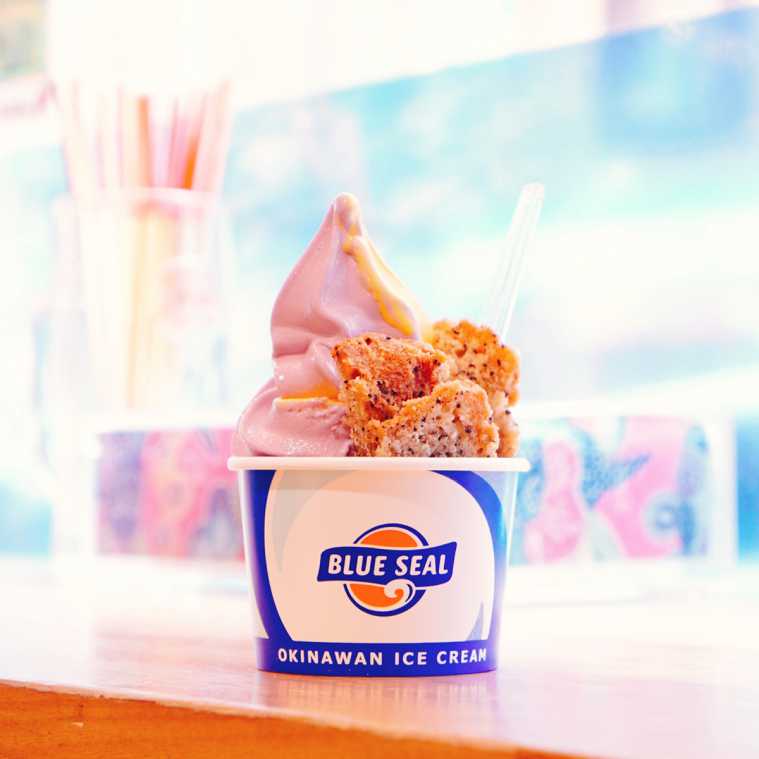 ショッピングを楽しんだ後は、1階奥のイートインスペース「CAFE N CHU(カフェンチュ)」でひと休み! 沖縄の人気アイスクリーム店「BLUE SEAL(ブルーシール)」のマンゴーと紅芋のコクのある甘さが心地良いアイスクリームと、ご当地スイーツのサーターアンダギーが夢のコラボを果たした「ソフトダギー」を味わいながら、沖縄に想いを馳せましょう。