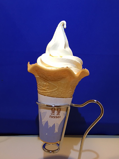 そのスイーツが、ちょこんと魚の形のモナカがのった「ここ滋賀ソフトクリーム」(400円)。お味は、プレーンや、抹茶、ほうじ茶もありますが、なんといっても注目したいのが「ふなずしフレーバー」です。