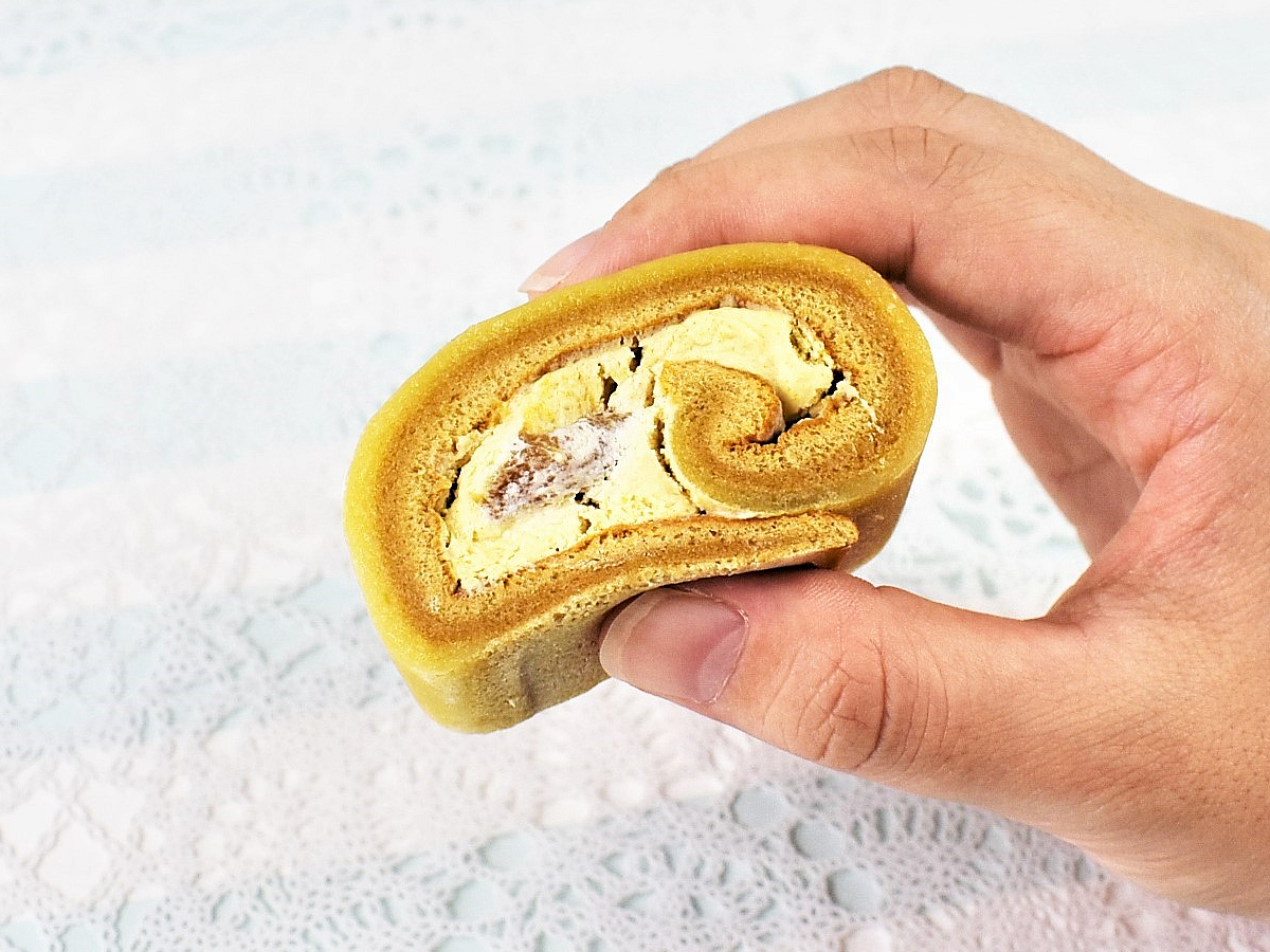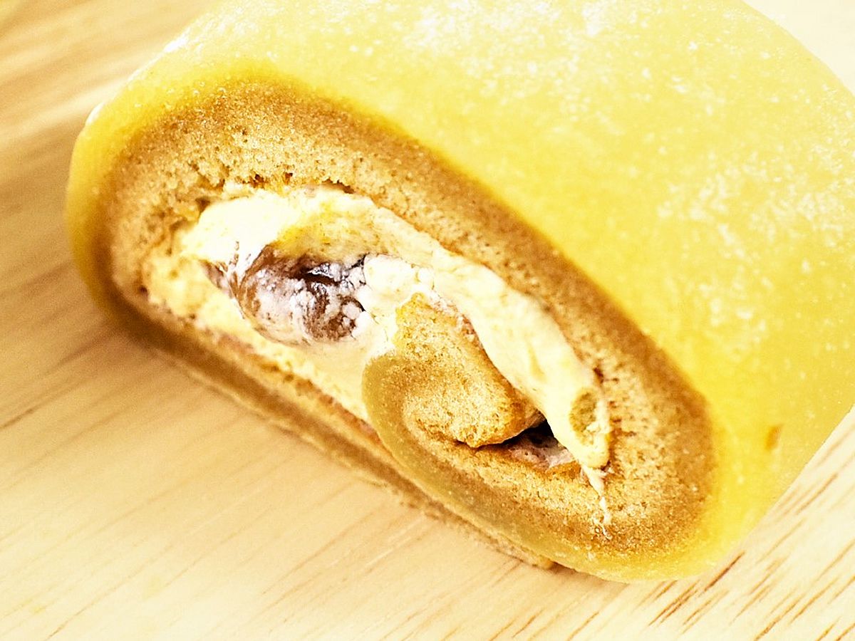 「もち食感ロール」は、きなこクリームと黒みつソースが茶色い求肥で包まれた一品です。真っ先に目を奪われたのは、まるでロールケーキのような見た目。食べやすい大きさにカットされており、“コロコロ”とした形がとってもキュートですね。