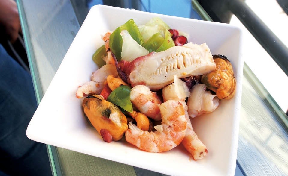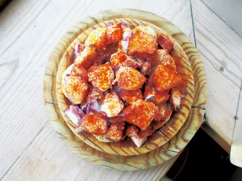 魚介を使った料理の専門店「テイスティ・アウェイ」では、シーフード料理や、サラダなどの付合せが購入できます。写真は、ゆでたタコにパプリカパウダーを振った冷製タパス「プルポ・ア・ラ・ガジェガ」。ホールで€15.90。