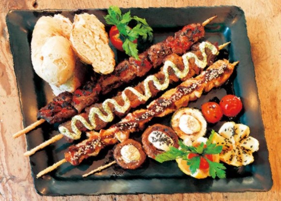 さまざまな食材をブロチェタス(串)に刺した、オシャレなタパスがいっぱいのお店「ラ・ブロチェッテ」もおすすめです。写真は上から牛肉、鶏肉、野菜の串焼き。盛付けも彩り豊かです。1本€5.90。
