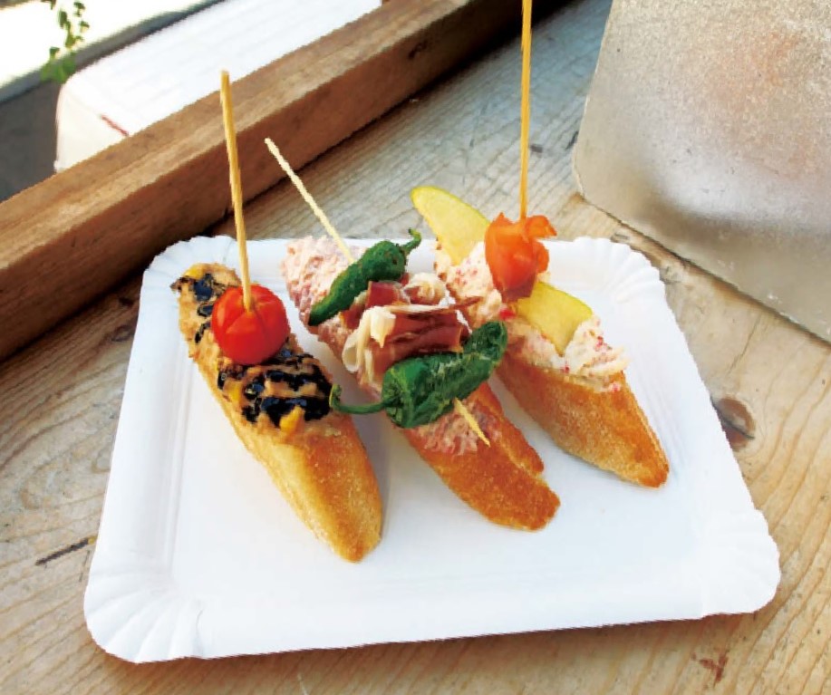 スペインの定番メニュー、ピンチョスのお店「ピンチョランド」では、さまざまな種類のピンチョスを味わうことができます。ししとうやサーモン、チェリートマトをのせたピンチョスのセットは3個セットで€10。1個で買う場合は€3.50。