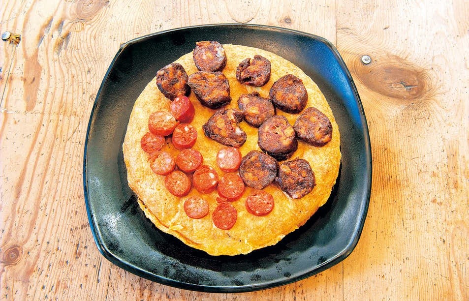 スペイン風オムレツのトルティーリャをはじめ、卵料理がテーマのお店「グランハ」では、2種類のソーセージを使ったスペイン風オムレツ、トルティーリャ・コン・チストーラ・イ・モルシージャ(タパ €5、ハーフ€9.50、ホール€14)を味わえます。