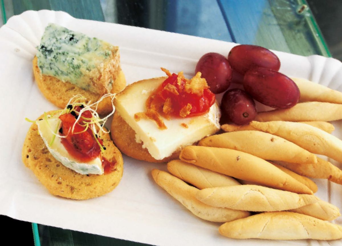 見た目もかわいい一口サイズのチーズが、ショーケースに豊富に並ぶチーズ屋さん「ミヤ・バルダロス」。写真左半分の3つのチーズは、各種チーズにイチゴ酢、トマトジャムなどをトッピングしたもの。1個€1.80。