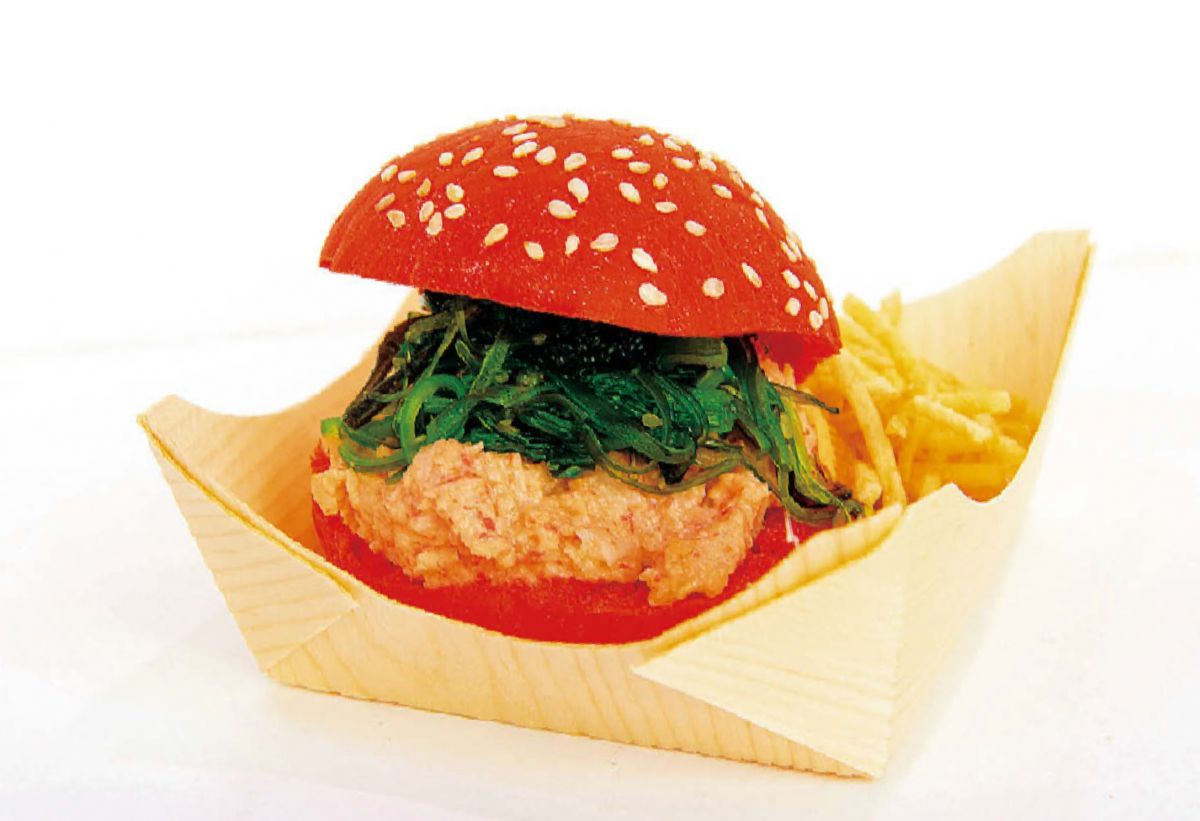 カニ好きにはたまらない!サラダやサンドイッチなど、さまざまな料理にアレンジしたカニ尽くしのお店「クラブ・クラブ・クラブ!」。カニの身、ワカメ、キャビア入りのバーガー「アンブルゲサ・デ・カングレホ」は、カラフルなバンズがとってもキュート。€3.50。