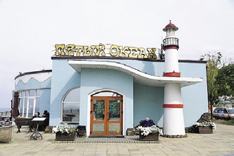 海岸通りの端に位置していて、観光客にフレンドリーなお店としても有名な「ピャーティー・オケアン」。海沿いにたたずむ灯台のオブジェが目を引きます。