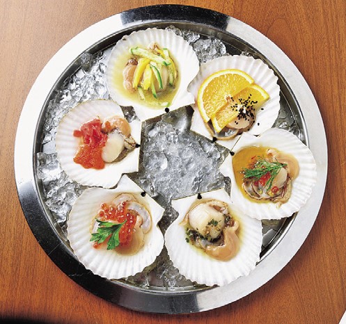 6種類のホタテ盛り合わせ(1520P)は、大ぶりのホタテにさまざまなトッピングを。なかには、オレンジなど大胆なトッピングも!