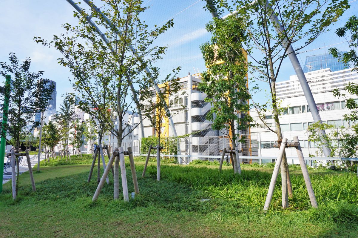 「MIYASHITA PARK」全体を包み込む緑の天蓋は、自然の風と緑を感じられる雰囲気を演出し、夏には日光を適度に遮り、木陰をつくる役割も。