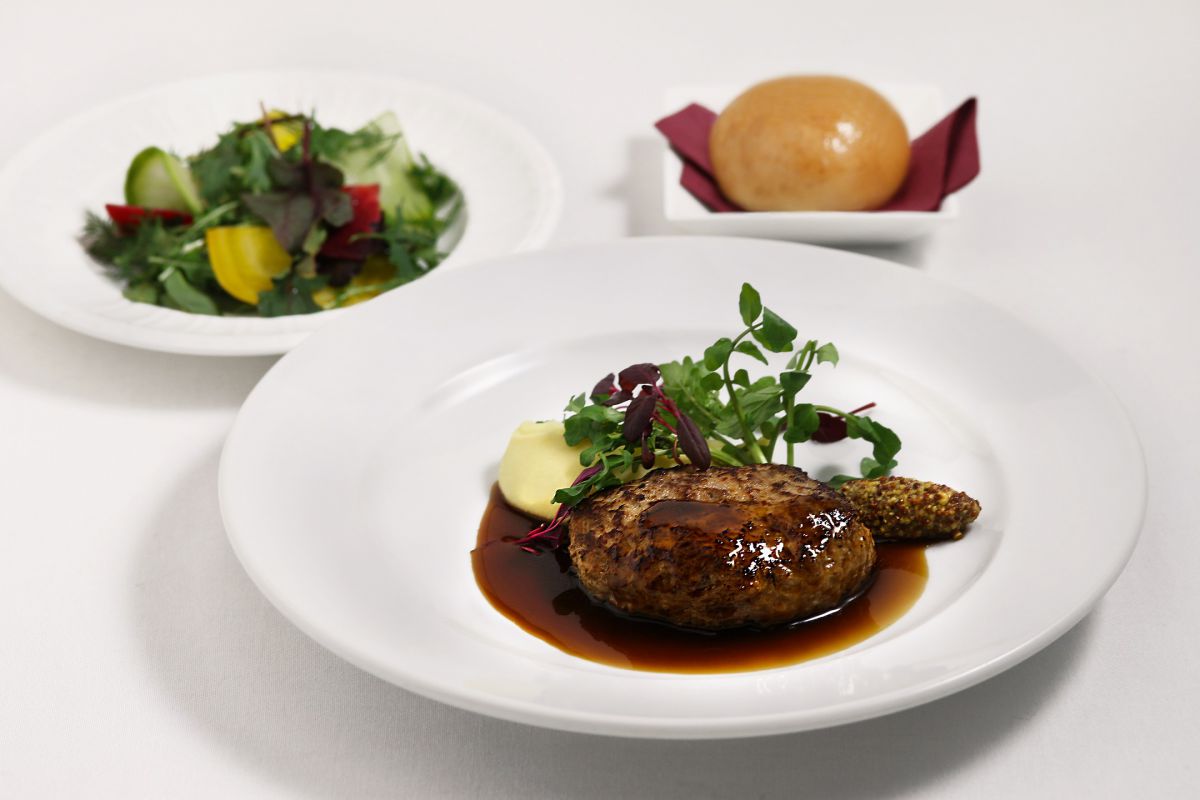 人気の「Café1894ハンバーグステーキ マデラソース」サラダ、パンorライス付き2000円は、手ごねハンバーグをふっくら焼き上げた贅沢ランチ。濃厚なマデラソースがハンバーグのおいしさを引き立てています。