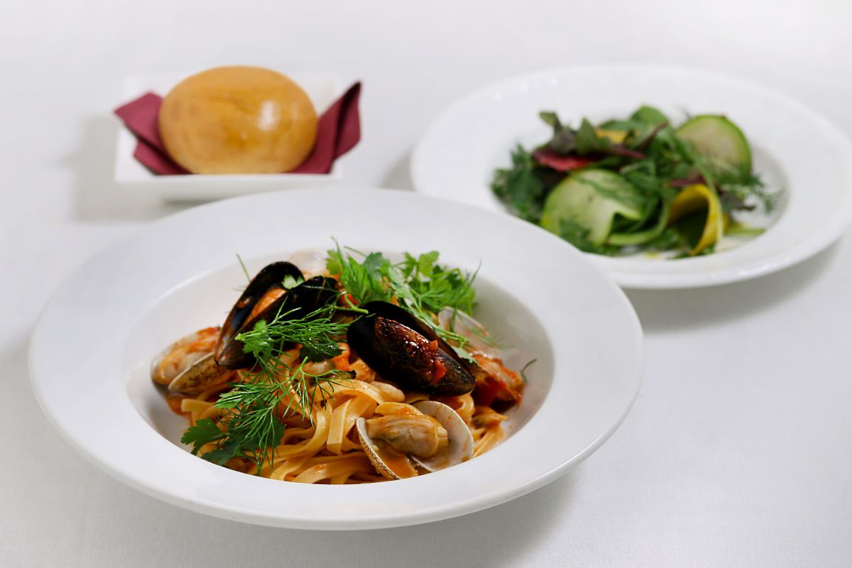 ムール貝、エビ、イカ、ホタテを贅沢に使用したCafé1894オリジナル「魚介のブイヤベースソースパスタ~ペスカトーレ~」サラダ・パン付き1700円。