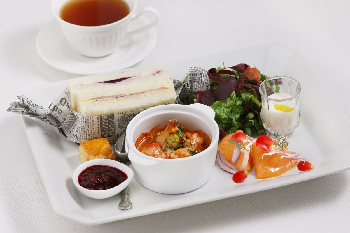 プレートには「海老とブロッコリーのアメリケーヌグラタン」「ブルーベリーとクリームチーズのサンドウィッチ」「スモーク鴨のサンドウィッチ」「モネのグリーンサラダ シーザードレッシング」「サーモンとカブ アーリーレッドのマリネ」「自家製スコーンとラズベリー」が一皿に。季節ごとに変わるハーブティーも楽しみのひとつです。