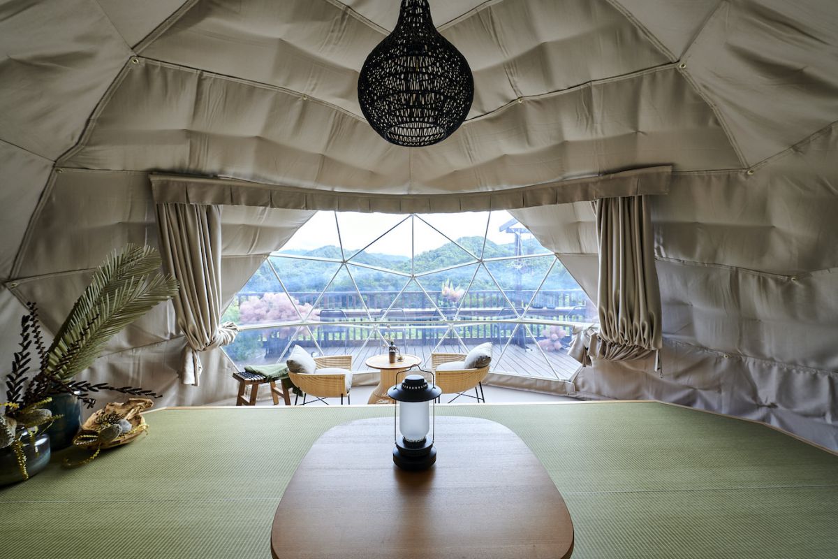 2020年8月にグランドオープンした、日比谷花壇が手がけるグランピングサイト。山並みを望むパノラマデッキとカウンターテーブル、広々としたドーム型テント、地元の工房で作られたガーデンテーブルなどこだわりの家具に、日比谷花壇がコーディネートした植物が調和。相模原市藤野の自然と一体化した空間で、リラックスしたひとときが過ごせる。藤野産の有機野菜や海の幸・山の幸を使った食事も、楽しみのひとつ。