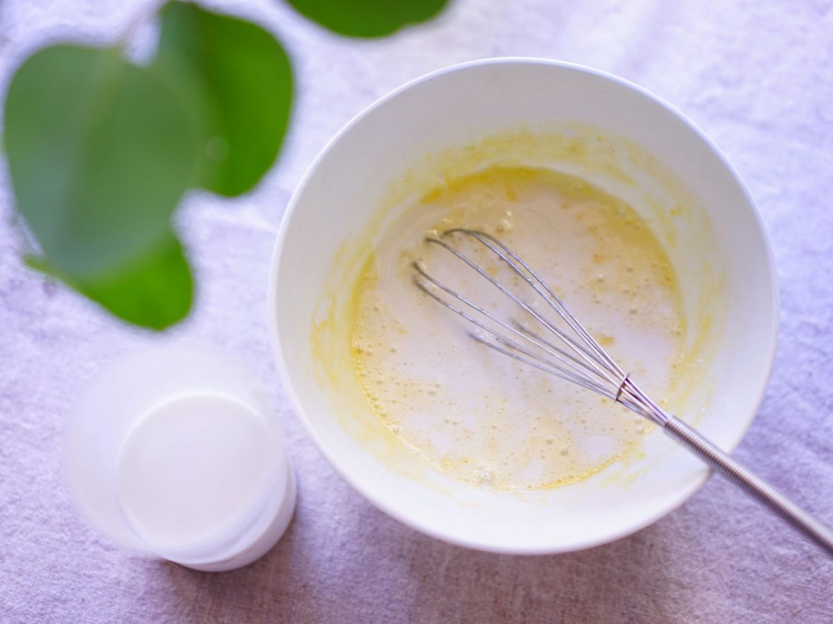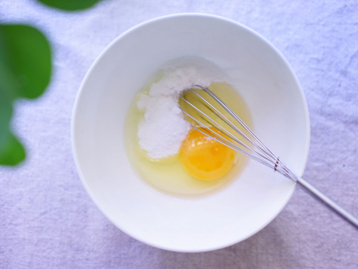 ボウルに卵とグラニュー糖を入れ、卵白のこしを切るようにしてよく混ぜます。