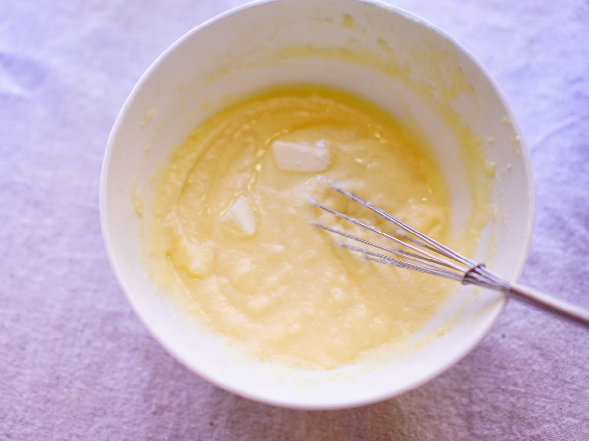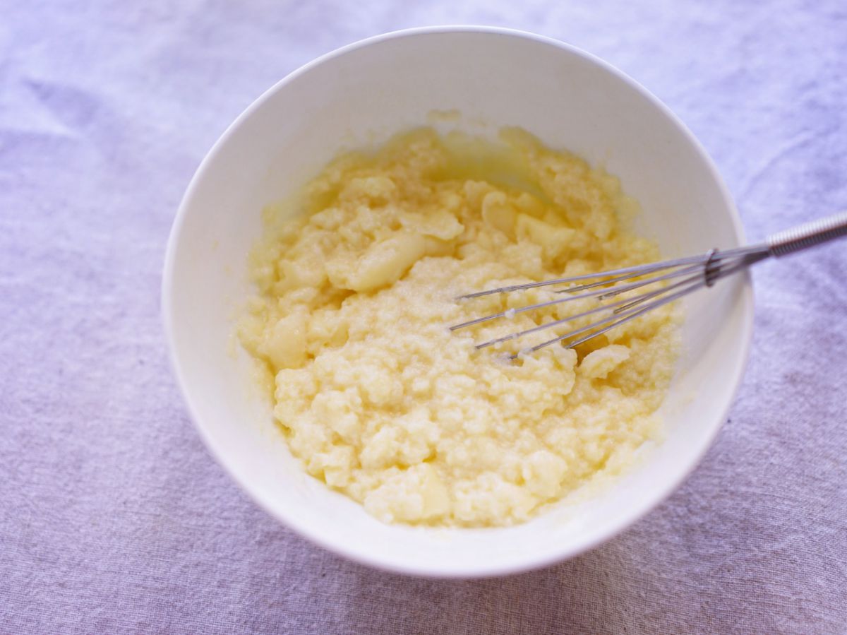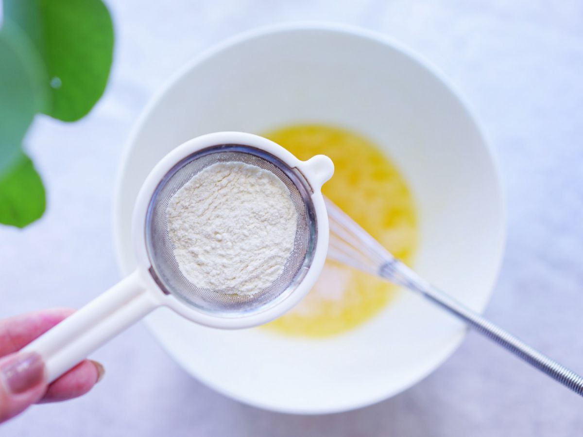 薄力粉をふるいながら加えて、だまが残らないようにしっかりと混ぜます。