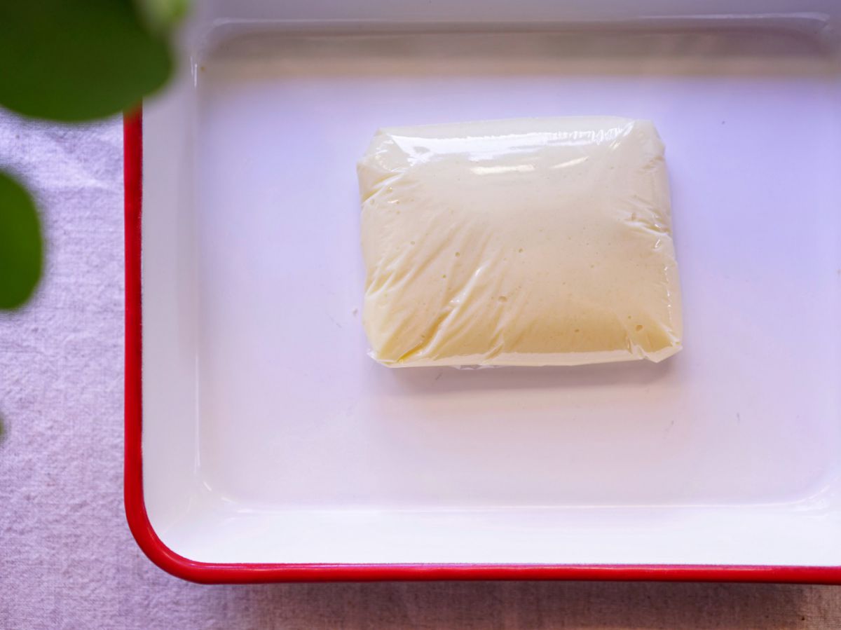 ラップでぴっちりと包んで、冷蔵庫で冷やします。