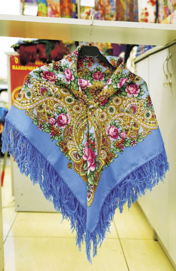 こちらはロシアの伝統的な女性向けストール、プラトーク(1260P)。花柄が多く、礼拝で教会へ行くときには欠かせません。89×89cmのほか、サイズによって値段は異なります。