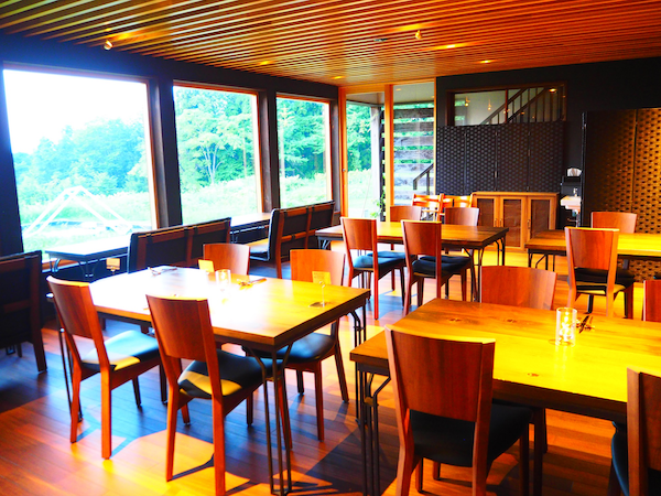 エントランスを抜けると、大きな窓の向こうにどこまでも広がる森と木のぬくもりが特徴的なダイニング「醸す森バル」があり、地元野菜をたっぷり使ったカジュアルフレンチをいただくことができます。お料理に合わせるワインや日本酒の品揃えも豊富なので、ぜひお料理とのマリアージュを楽しむのがおすすめ。