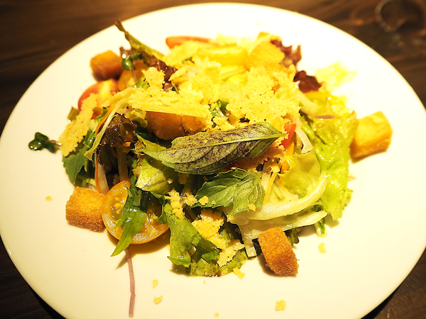 今回いただいたのは、まつのやま茶倉と醸す森の特別コラボディナーコースです。食材の地産地消にこだわったお料理を楽しむことができます。季節野菜のサラダには、ホーリーバジルがふんだんに使われているので、ふわっと漂うハーブの香りに食欲が進みます。