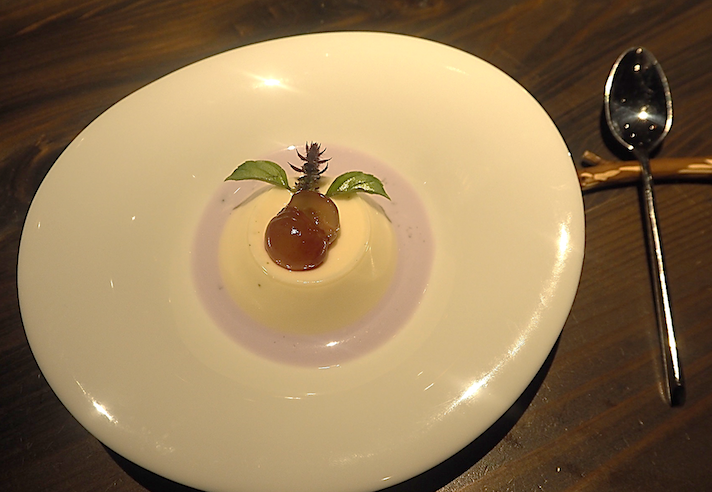 デザートは「ホーリーバジルのブラマンジェ」。コースの最後までホーリーバジルを楽しめます。煮出したホーリーバジルのほどよい苦みと甘酸っぱいブルーベリーソースがベストマッチ。