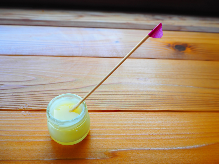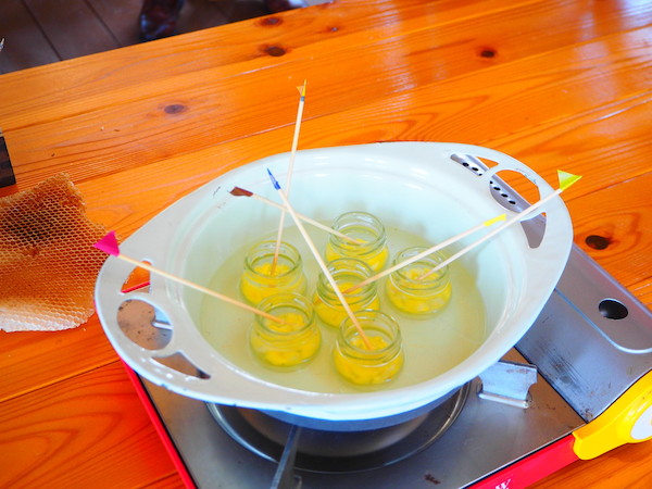 今回私が体験したのは、ミツロウクリーム作り。まさに自分でつくるオーガニックコスメです。作り方はとてもシンプルで、ミツバチの分泌物であるミツロウにホホバオイルを加え、火にかけてゆっくりと溶かしかき混ぜて、最後にお好みのエッセンシャルオイルで香り付けをします。