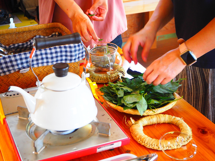お茶としても楽しめる黒文字。葉っぱや枝を煮だしていただきます。ひとくち口に含むとふわっと森の香りが漂うやさしいまろやかな和製のハーブティー。緑になったり、ピンク色になったり…枝、葉、茎、黒文字のどの部分を煮出すかでそれぞれ色や風味が異なるのも、実験気分で楽しいティータイムでした。