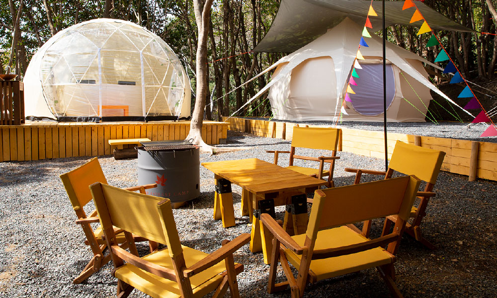 名前のとおり、森の中のテントで快適に宿泊できるグランピング施設。お湯も使える専用ジェットバスを備えたテントサイトにはベッドやソファベッドはもちろん、冷蔵庫やケトル用ガスコンロ、食器類、ドレッサーなどが揃う。スタンドアップパドルボードやシーカヤックは、目の前に広がる白浜の海で楽しめる。ほかにも森の中を疾走するバギーツアーや、インストラクター指導によるスカイダイビングも体験できる。