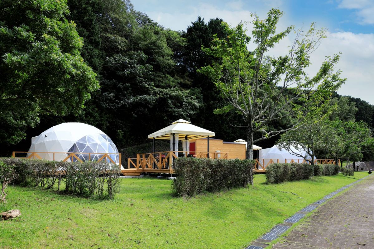| 料金 | デイキャンプ1組(5名まで):2200円、オートキャンプ1区画:3300円~、グランピングドーム2万2000円~。コテージ1万4800円~ |
