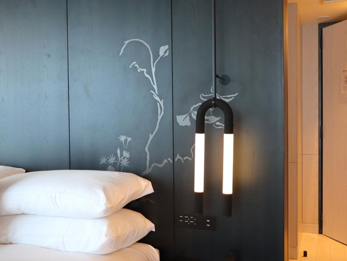 客室には、和テイストのユニークなデザインの備品が揃っています。ベッドサイドにある変わった形のランプは、日本の伝統的な髪飾りをイメージしているのだそう。こちらは全客室に設置されています。