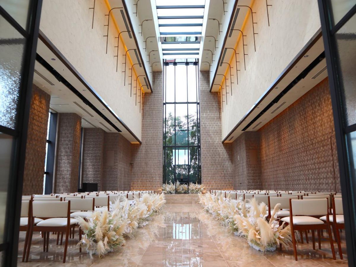 16階に位置するチャペルは、天井から入る自然光が明るく開放感のある空間。約80名を収容可能。こちらはチャペルとしてだけでなく、立食パーティーやアートギャラリーとして、幅広く利用できます。ここで結婚式が開けたら…と、ラグジュアリーな雰囲気にうっとり。