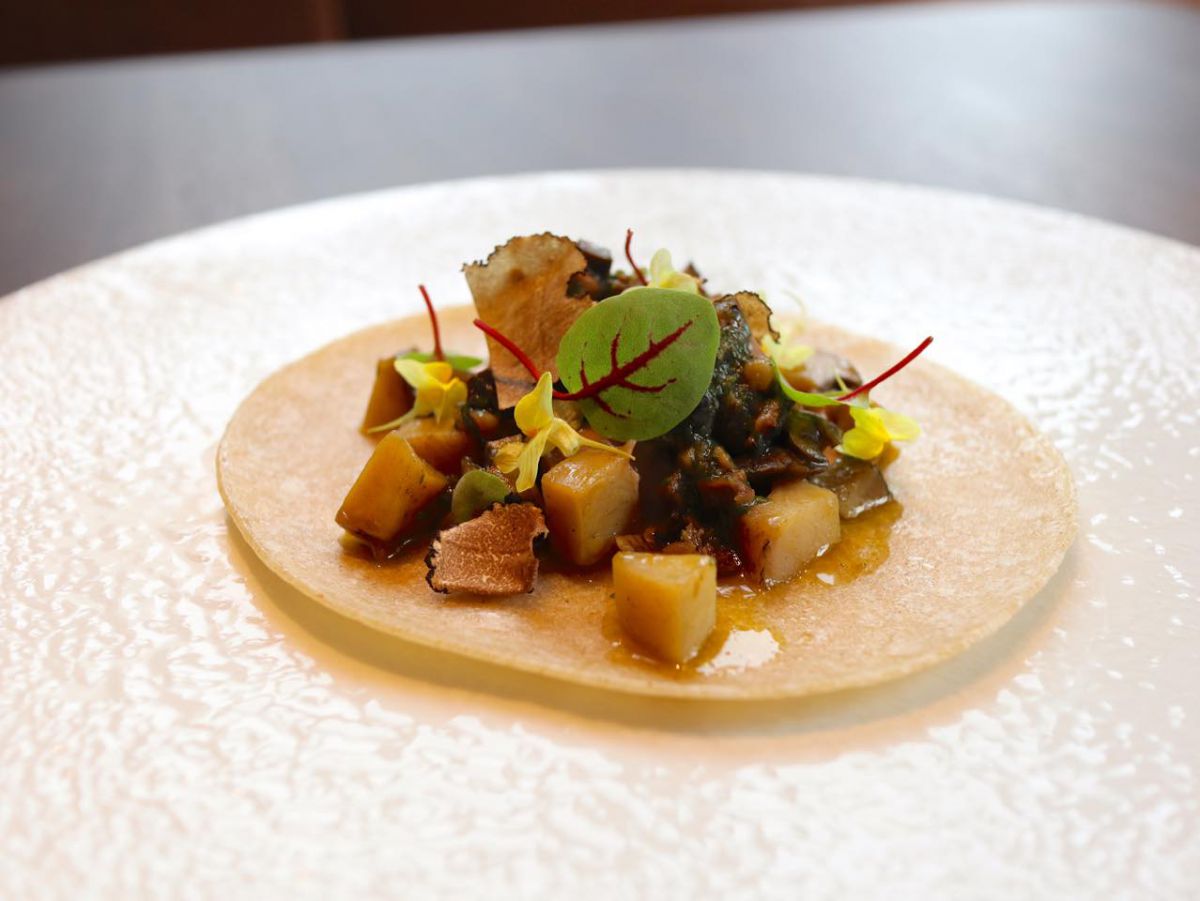 看板メニューの「コンフィー アワビのトスターダ ソバトルティーヤ 肝のソース チェスナッツ 黒トリュフ」は、そば粉で作ったトルティーヤにアワビやチェスナッツ、黒トリュフをのせた前菜。コース料理にも登場するので、シャンパンやワインと合わせて味わってみてください。