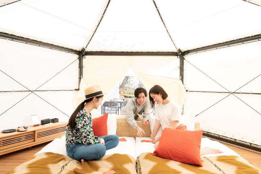グランピングは室内にシャワー、トイレを備えた「ジャーニーテント」と高級トレーラーハウス「コンフォートRV」、プライベートジャグジーがある「アウトルックキャビン」、ホテル棟の「マウンテンロッジ」にはお風呂も備えており、思い思いのグランピングを楽しめる。またアルコール含むドリンクや朝ヨガ体験、まき割り体験、夜はキャンプファイヤーでスモア体験など多彩なアクティビティがオールインクルーシブで贅沢な時間を満喫。隣接の筑豊緑地は遊具や、テニスコート、バスケットゴールがあり、お子様も楽しめる。