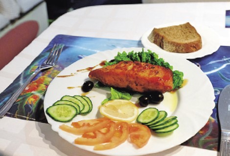 メニューは、ロシア料理やアルコールが充実していますよ。こちらはサーモンのステーキ1000P。