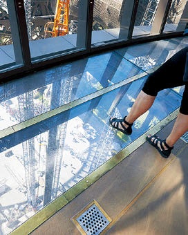 第1展望台は、3つの展望台のうち一番広いフロア。写真の通り足元が透明の板ガラスになっていて地上が見える場所があり、スリル満点です!
