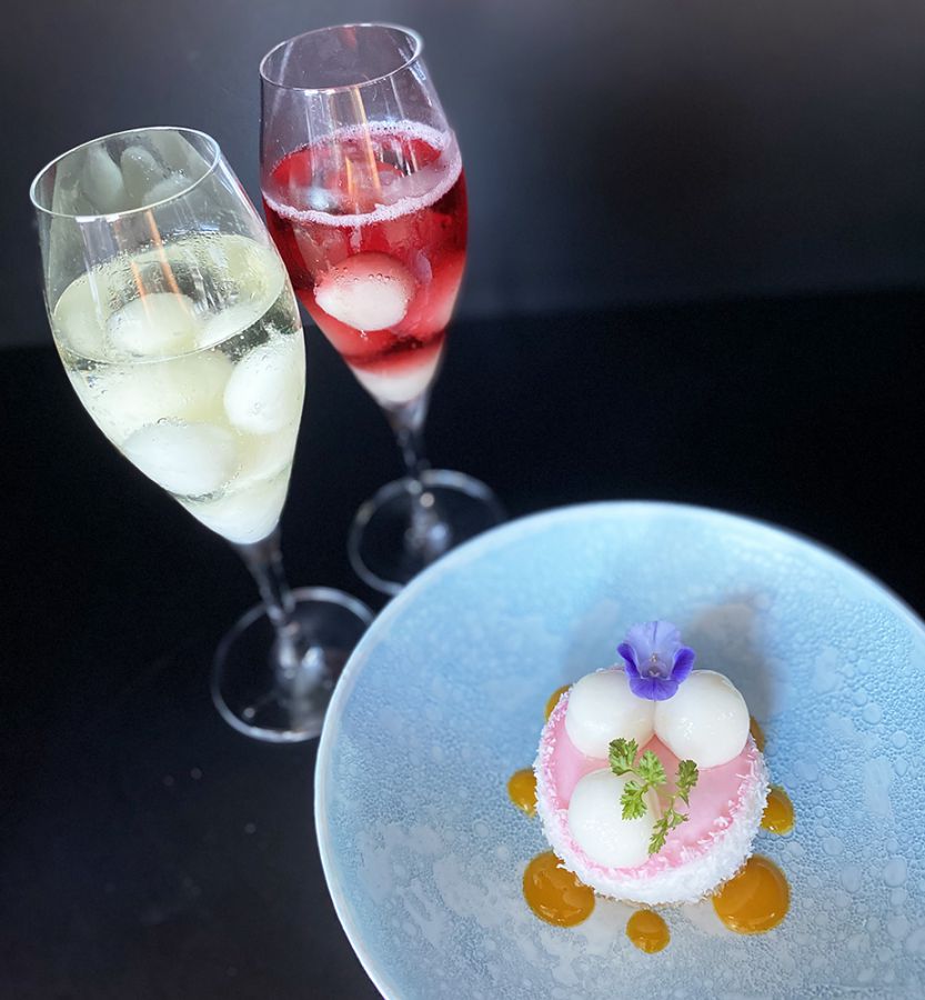ライチのババロア「チャイナムーン」 は、パッションフルーツが鮮やかなエキゾチックソースがアクセント。満月に見立てたお皿にのって運ばれてきます。グラスの中で氷菓が月のように浮かぶカクテルもセットとなっており、フォトジェニックなレストランで“甘いお月見”を楽しむことができます。