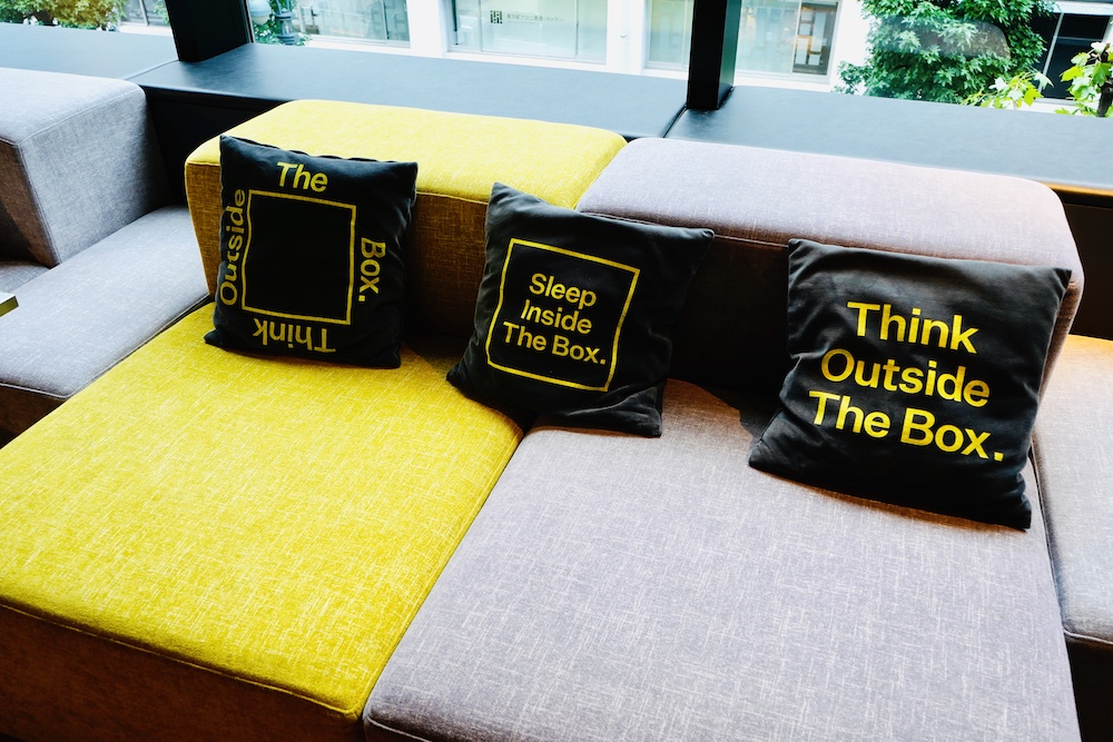 「.andwork」コンセプト「Think Outside The Box.」の文字が書かれたソファを発見。箱(ホテル)の中で寝ながら、箱以外(新しい領域)のことを考えよう!という意味が込められているんだとか。この空間でゆったりするだけで、新しいアイディアがどんどん浮かんできそうです。