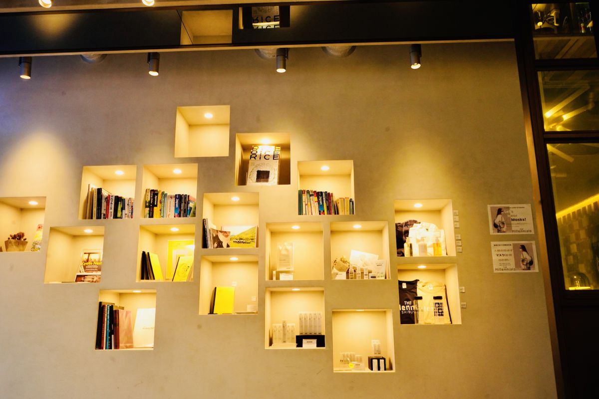 「3階ロビーラウンジ」の棚には物販スペースも。いま話題の男性用スキンケアライン「BULK HOMME」や、ホテルオリジナルのノートやバッチなどが購入できます。