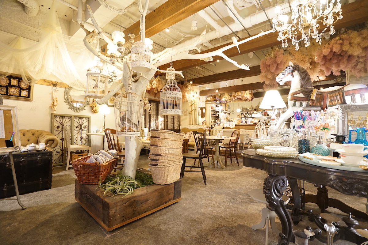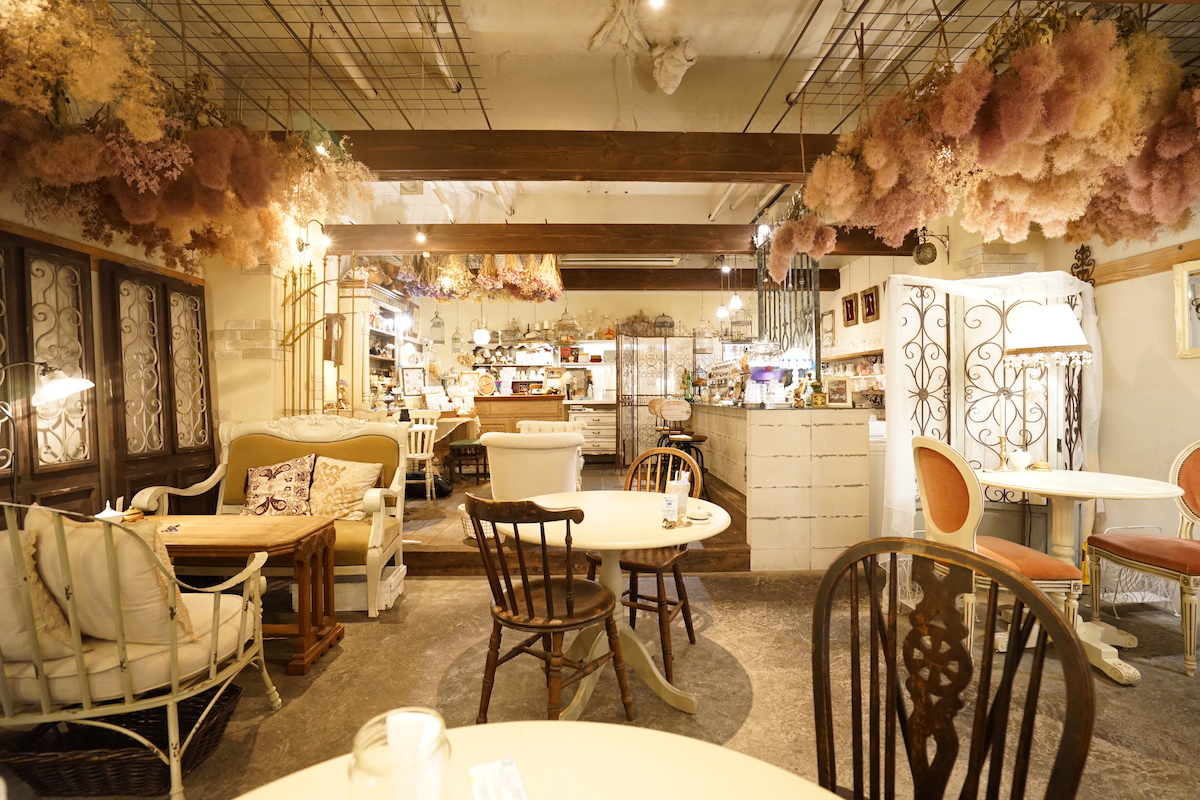 店内はどこもかしこアンティークな調度品やドライフラワーで埋め尽くされ、涙がでるほどかわいい…! 目に入るものすべてが現代的なモダンさからはかけ離れ、濃厚なかわいらしさに満ちています。これらはすべてオーナーの大角さんが学生時代からコツコツ集め続けたもの。「京都市内からすぐに行けて現実逃避できる、テーマパークみたいなお店にしたかったんです」と話します。