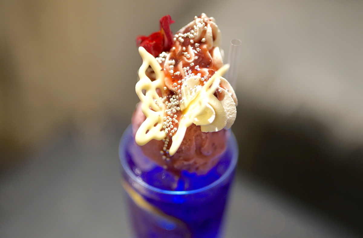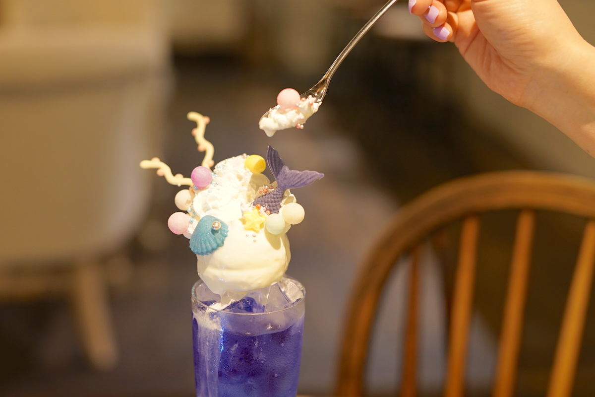 泡沫のようなデコレーションアイスをそっとすくい取り、ソーダをひと口。クリーミーなアイスと涼やかなソーダが溶け合い、魅惑のおいしさが口いっぱいに広がります。こちらのブルーの“シャイニーラグーン”のほかに、ピンクの“トワイライトラグーン”もあり、この2つを並べて写真を撮るのも人気なのだそうですよ。