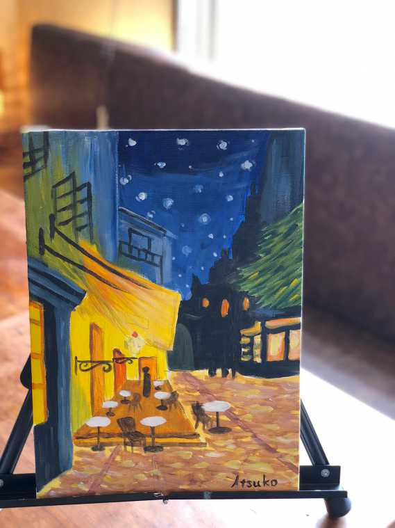 今回描く絵は、ゴッホの「夜のカフェテラス」。初心者でもこんな素敵な絵が描ける秘訣は、アーティストの先生がしっかりレクチャーしてくれるから。この会の講師は、壁画・アクリル画家で、小学校の美術講師も務めるメキシコ人のロチャ先生。現役アーティストから教えてもらえるのはうれしいですね!