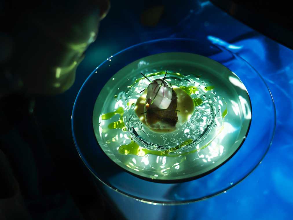 魚たちとの戯れを楽しんでいると、魚料理がサーブされます。テーブルの上を泳いだり、時おりお皿にやってくる魚たちや、プロジェクションマッピングによって皿の上で四季の移り変わりが見られる演出と共に、お料理を楽しめます。