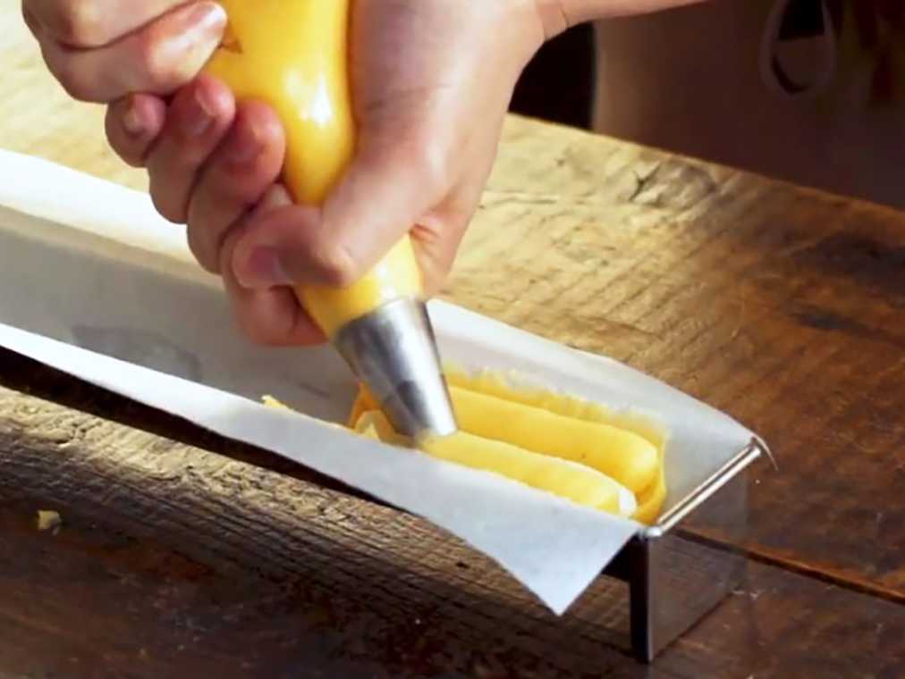 一辺3cm、長さ8cmの三角柱の「ポグ」は、持ってみるとなかなかズッシリした重さです。トースターで軽く温めてから2つに割ると…、中からクリームがとろ~り。