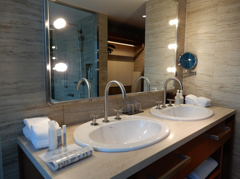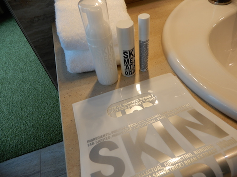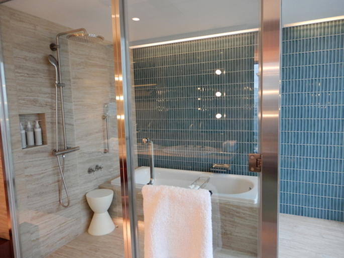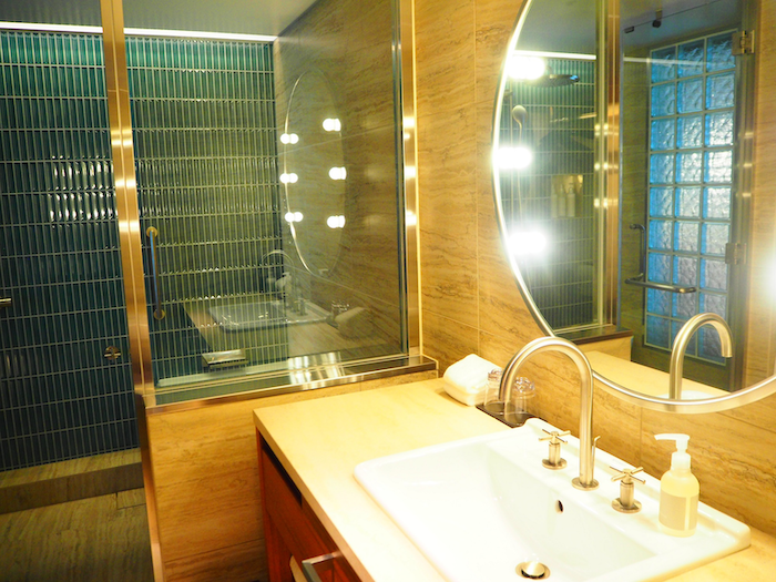 ブルーのタイルがなんとも洒落ているバスルームは、ガラスばりで明るくて広く、ゆったりと浸かれるバスタブがうれしい。女優ミラーにツインボールできれいに身支度できそう。歯ブラシキットなども含めて、使い捨てではなくて“持って帰ってもらえる”をねらったこだわりのアメニティ類。ジェンダレス、エイジレス、オールスキンタイプで注目のオルタナのオリジナルローションなども。