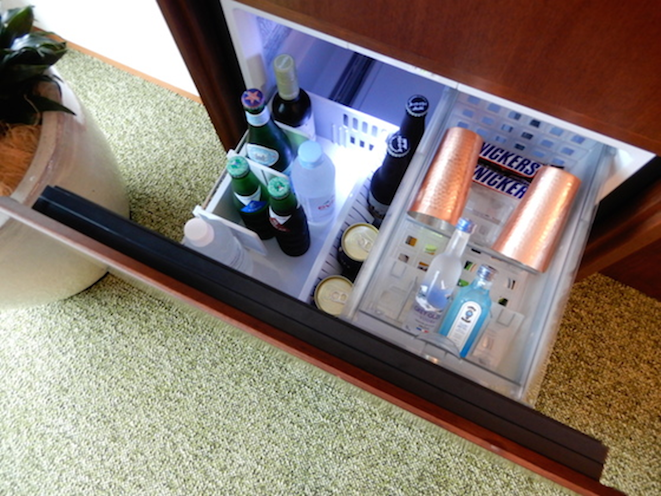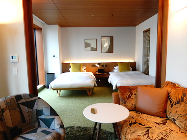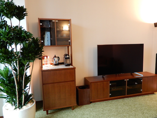 ミッドセンチュリーモダンな家具、生のグリーンが置かれているのが、アパートで暮らすかのような気持ちにさせるのかも。サイドの棚の下段は冷蔵庫になっていて、なかのドリンクは無料。冷やしたグラスにボンベイサファイアとトニックウォーターも。ジントニックで乾杯をしたい!