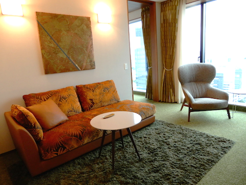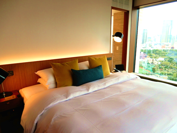 客室は、ドアを開けた途端にいきなり時代と場所を超えて、どこか60年代のニューヨークの瀟洒なアパートメント思わせる世界。ヴィンテージ感を醸すソファは、青山にショールームを構える家具のトップブランド「アルフレックス」オリジナル。窓からはこの高さから見ることはあまりない青山の光景が広がります。(スーペリアルーム約40㎡)