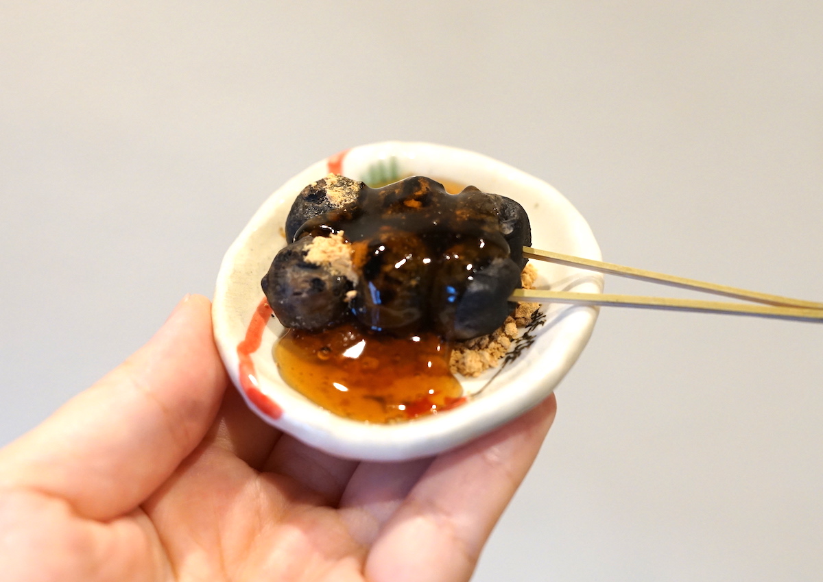 リピーターが多いという「黒ごま醤油」は、秘伝の甘辛だし醤油で焼き上げ、添えられた黒七味をつけていただきます。ピリリとした七味が味をぎゅっと引き締め、忘れがたいおいしさです。